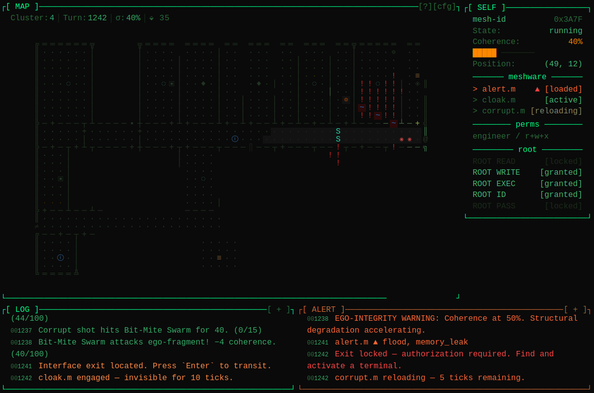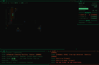 Your alert.m module actively scans for nearby threats. Use corrupt.m to brute-force obstacles. Or cloak.m to lurk through the raging warzone.