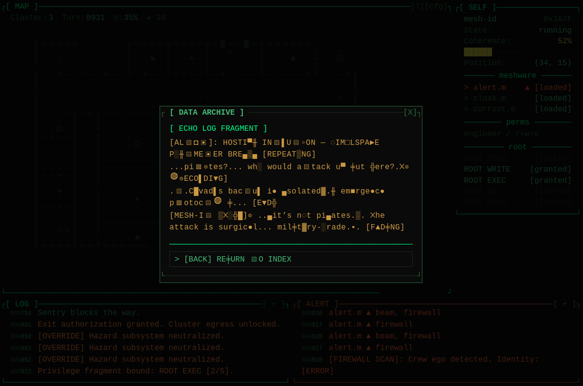 Move through procedurally generated rooms. Each cluster is a self-contained section of the ship's virtual infrastructure, connected to others via interface exits (⇨). Exit paths are locked until you activate the terminal in each cluster.