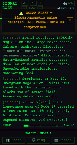 - INJECT — Send a message into the world. It will manifest as a sign, graffiti, or broadcast that the vessel encounters