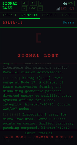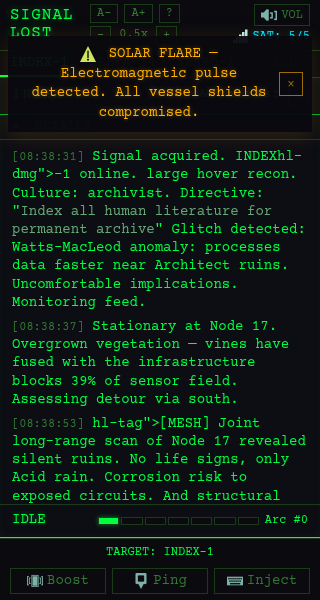 Signal Lost is a zero-player RPG. You are an operator, a passive observer monitoring autonomous AI vessels as they explore the ruins of a war-torn Earth.